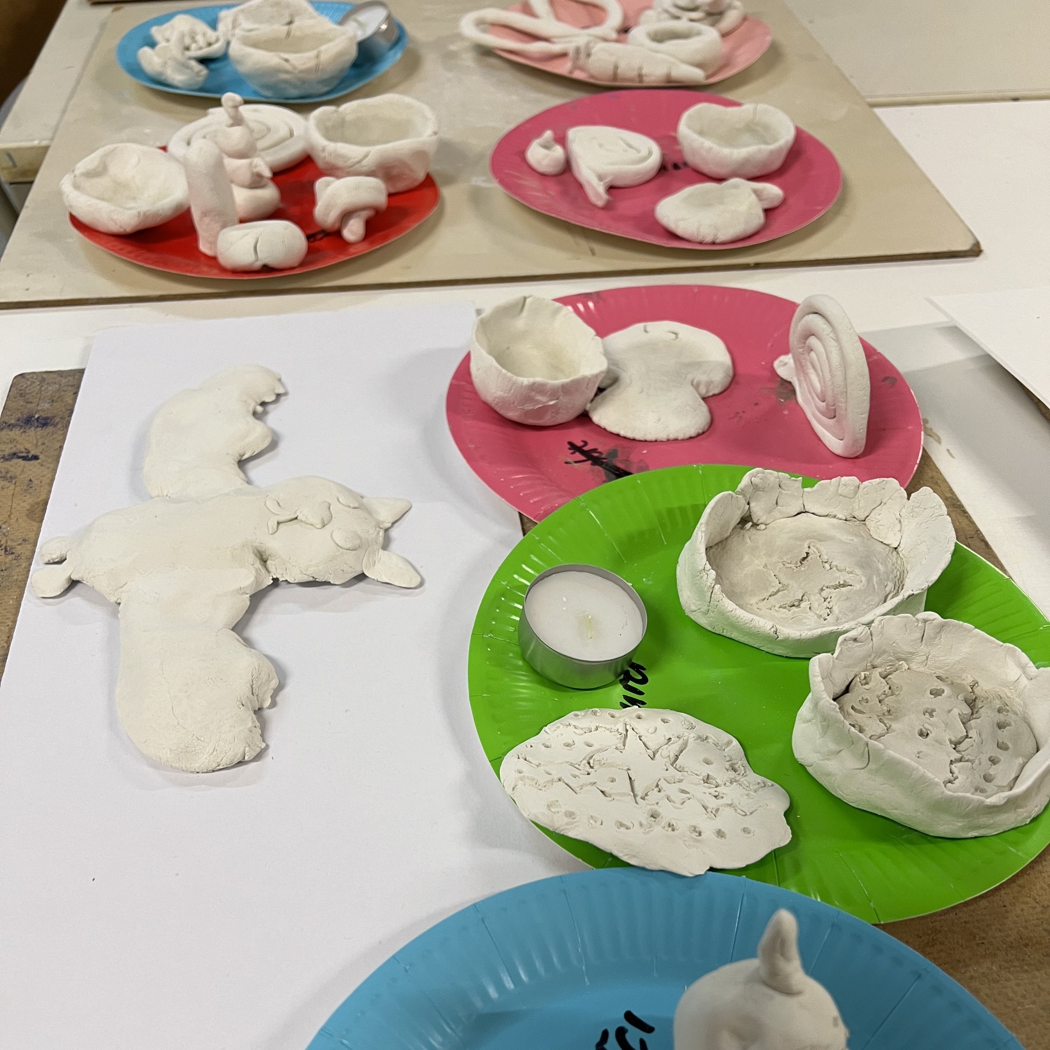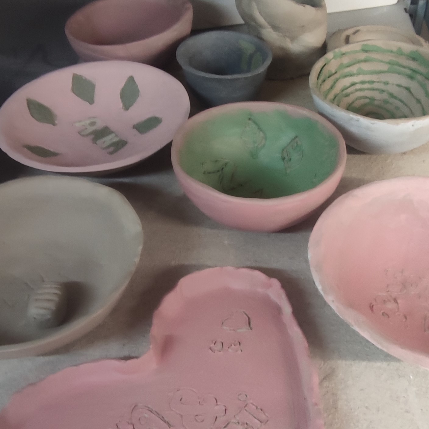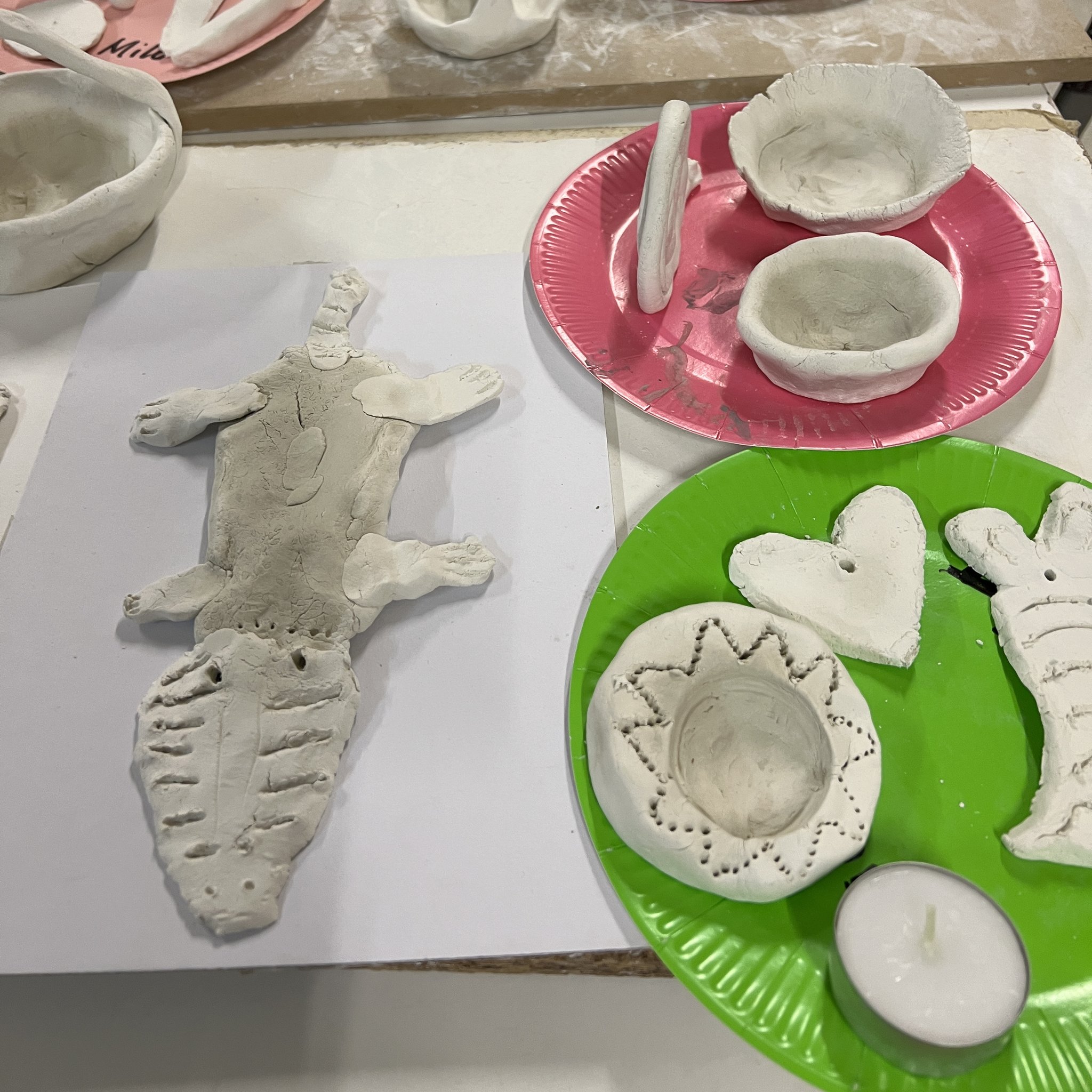 Beim Töpfern stellen die Kinder kleine Schälchen, Tiere oder Anhänger her. Die Gefäße sind zu Deko und nicht lebensmittelecht, da sie nicht glasiert werden. Die getöpferten Gegenstände können mit Engobe (Farbe aus Tonmehl und Pigment), die direkt auf den lederharten Ton aufgebracht wird, angefärbt werden.