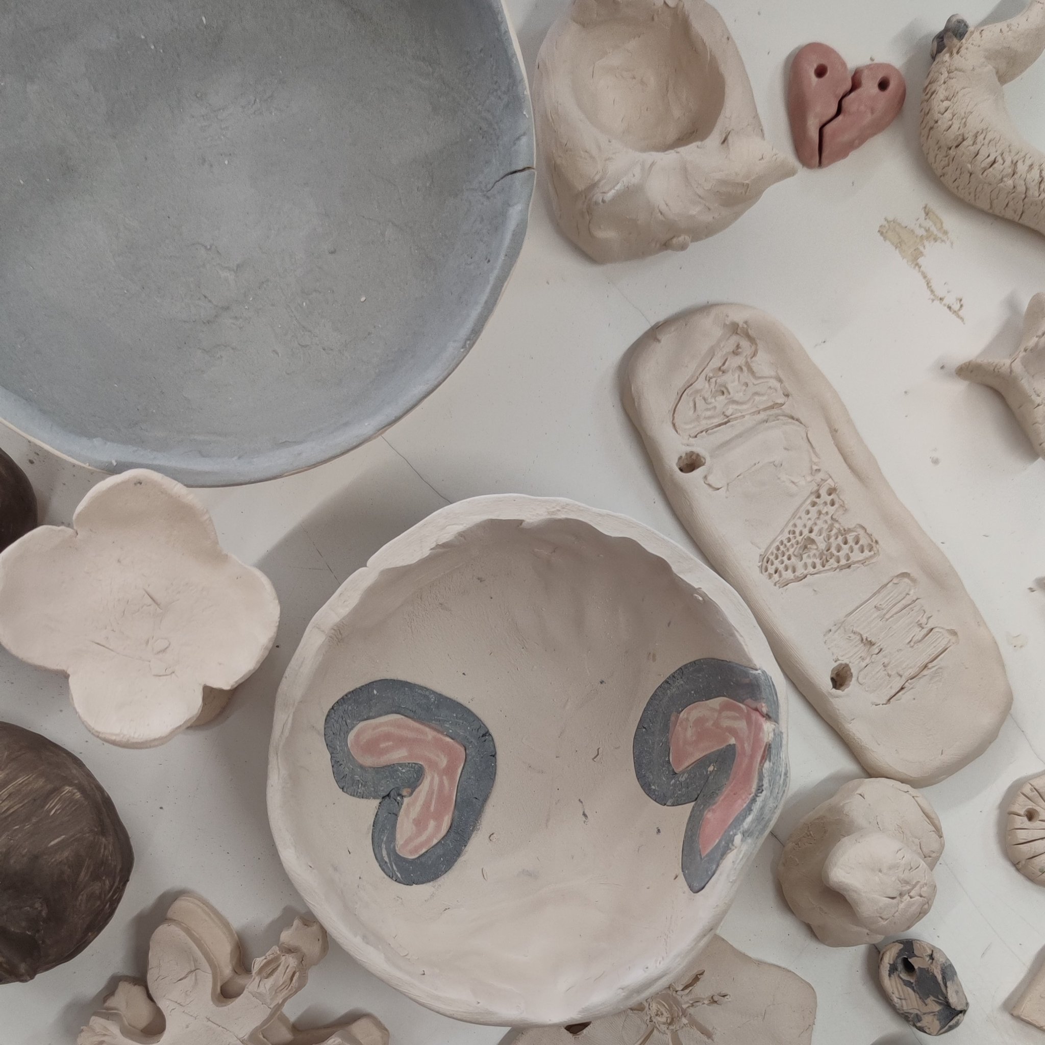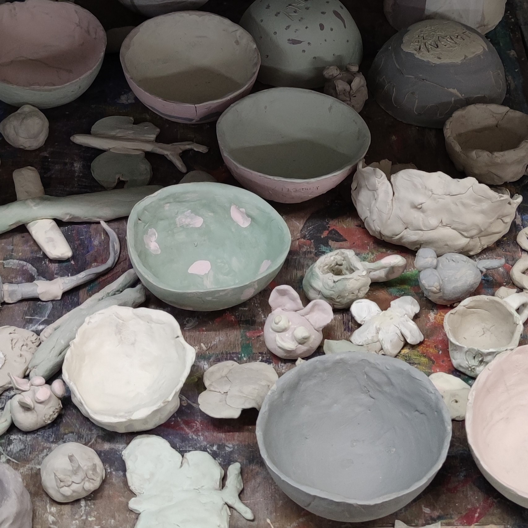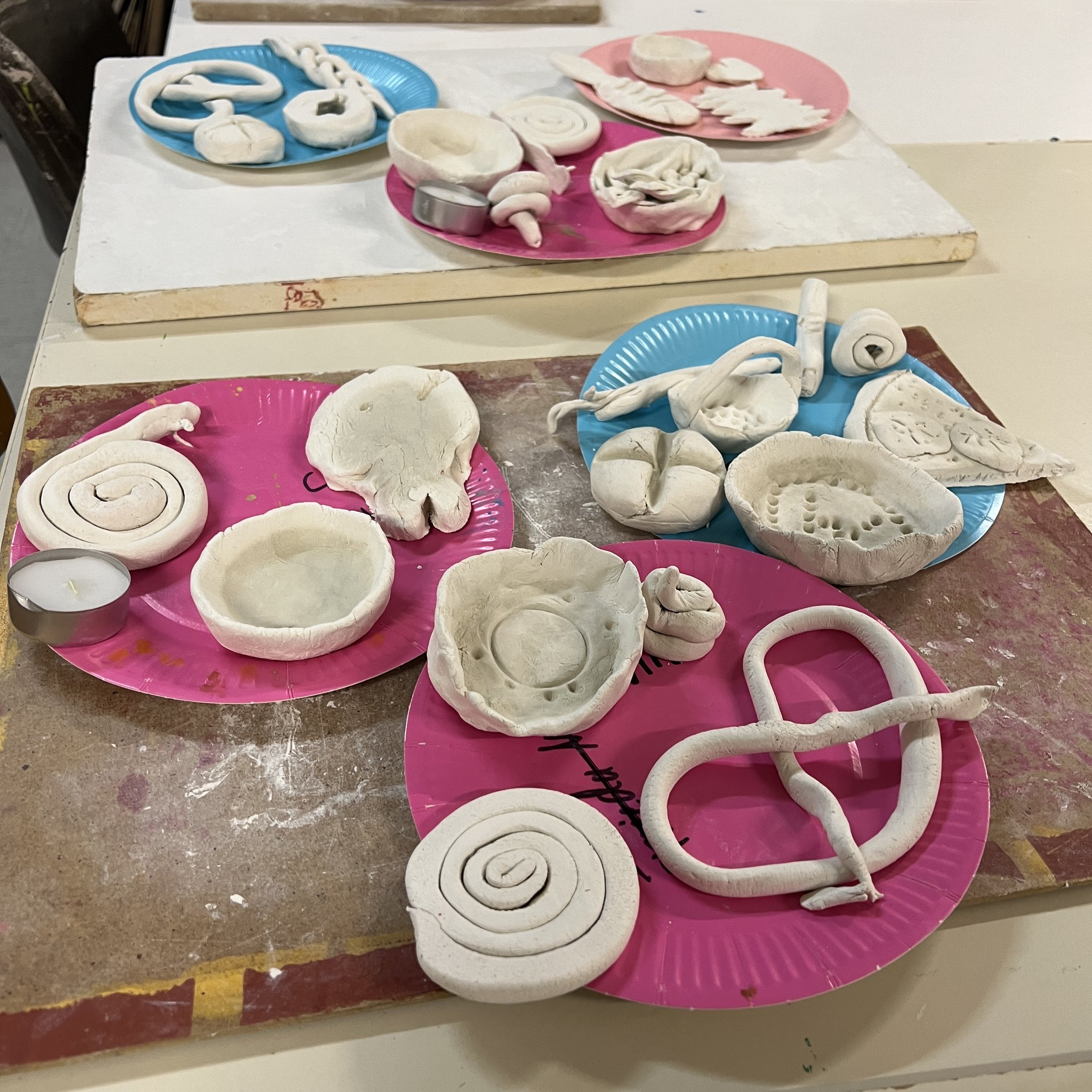 Beim Töpfern stellen die Kinder kleine Schälchen, Tiere oder Anhänger her. Die Gefäße sind zu Deko und nicht lebensmittelecht, da sie nicht glasiert werden. Die getöpferten Gegenstände können mit Engobe (Farbe aus Tonmehl und Pigment), die direkt auf den lederharten Ton aufgebracht wird, angefärbt werden.