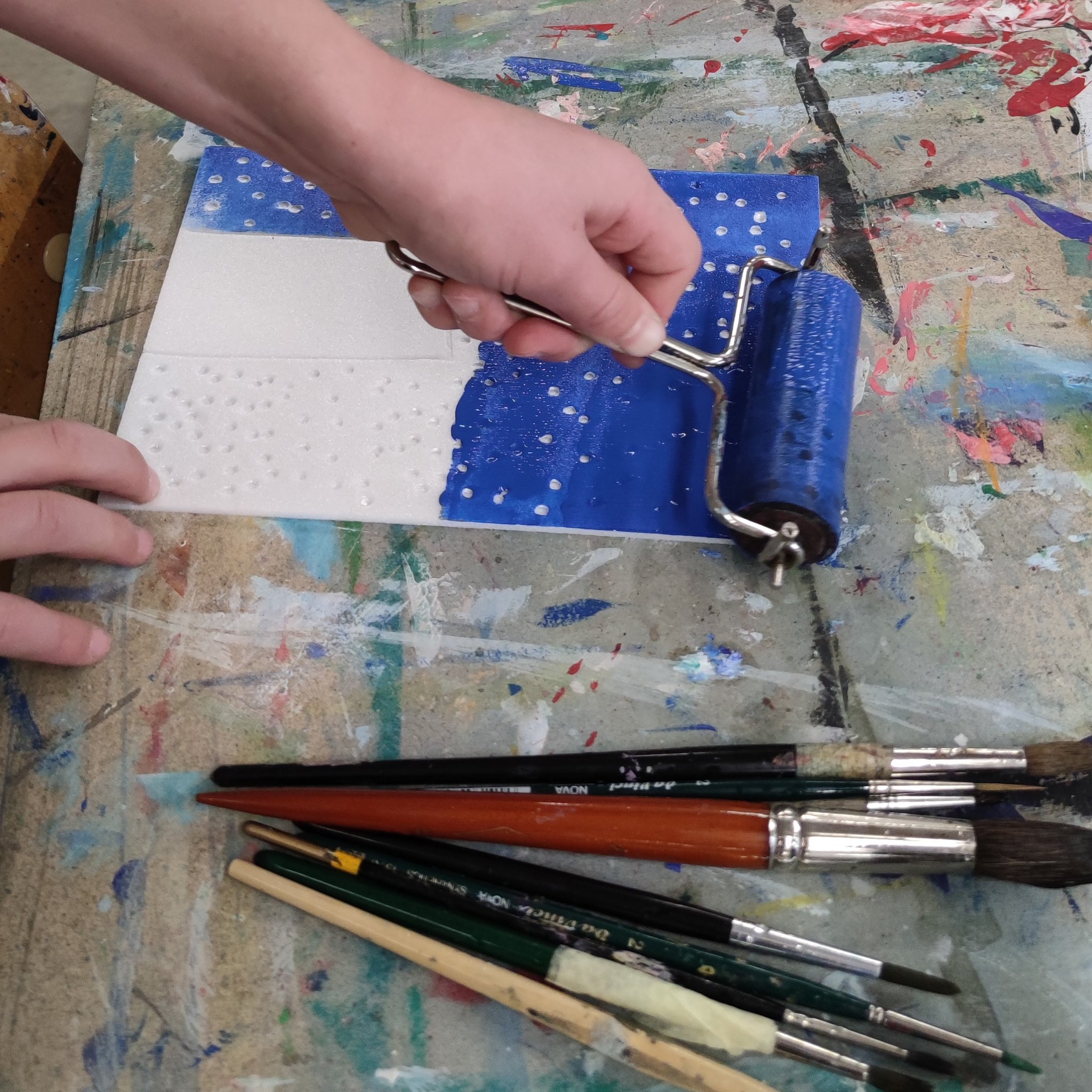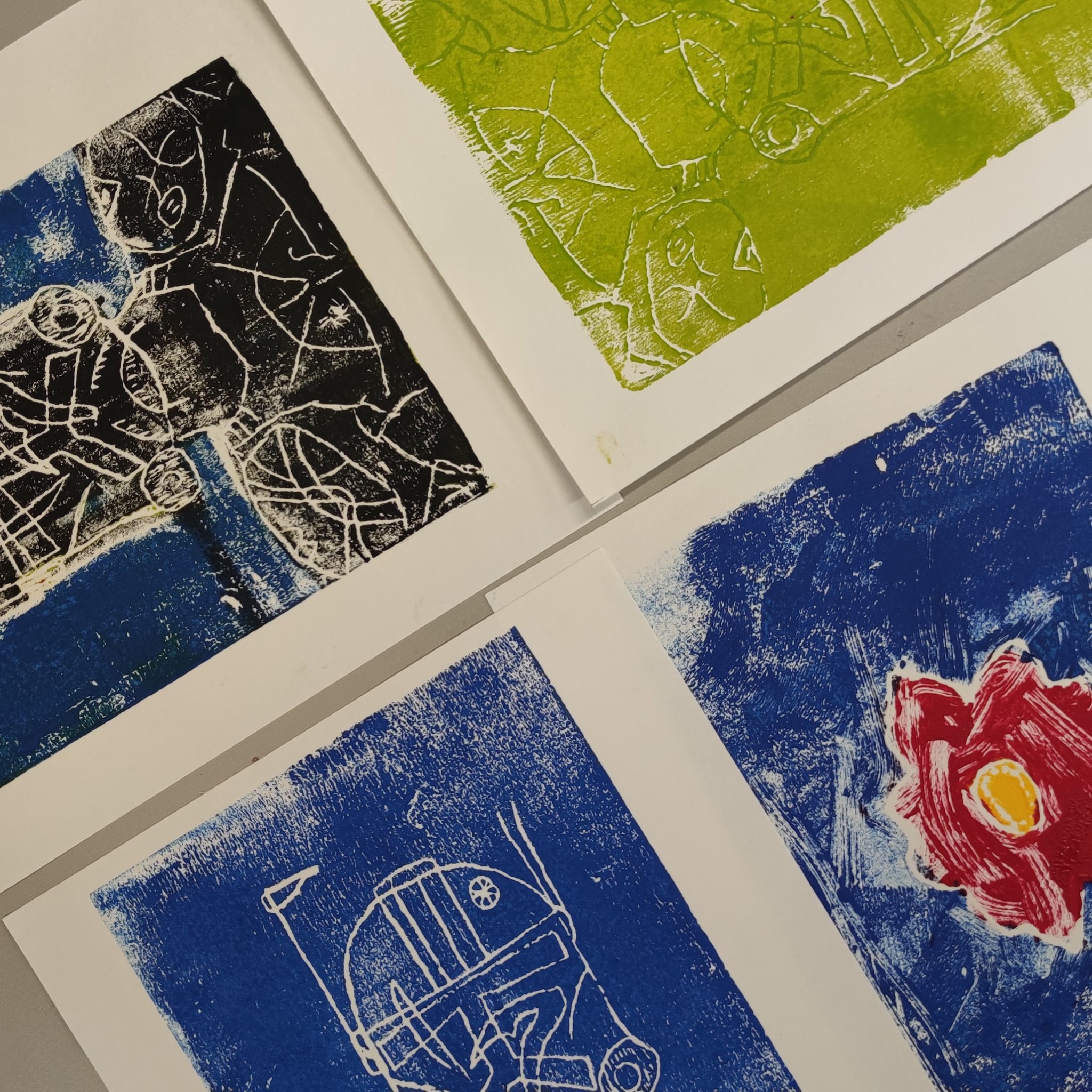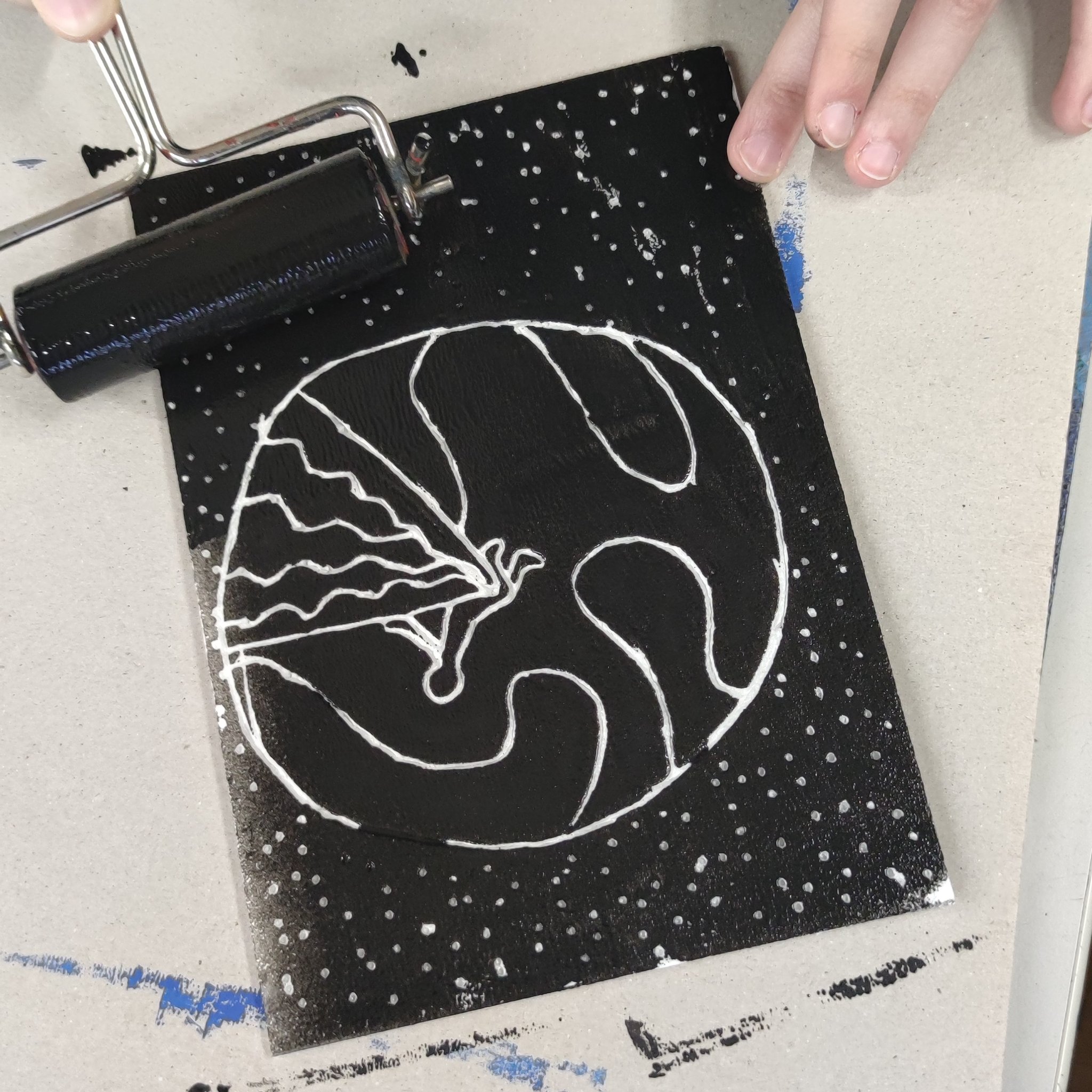 Bei der Druckgrafik wird ein Verfahren gewählt, welches möglichst einfach ist, damit es in der Zeit zu entsprechenden Ergebnissen kommt. Geritzt wird mit Bleistiften in eine Art von Styroporplatte. Diese wird dann wie bei einem Linolschnitt mit einer Farbrolle eingerollt und mit der Hand auf ein entsprechendes Papier gedruckt.