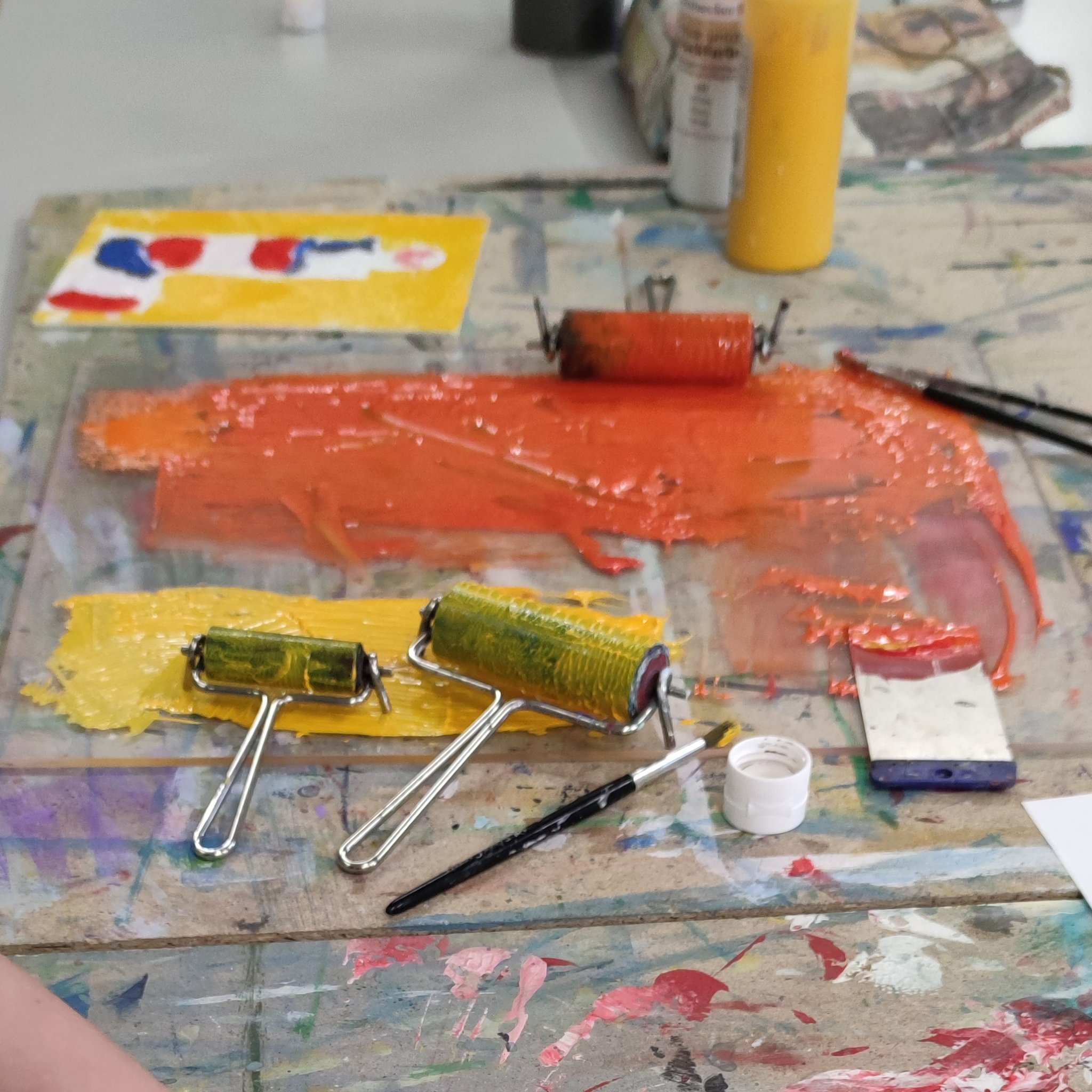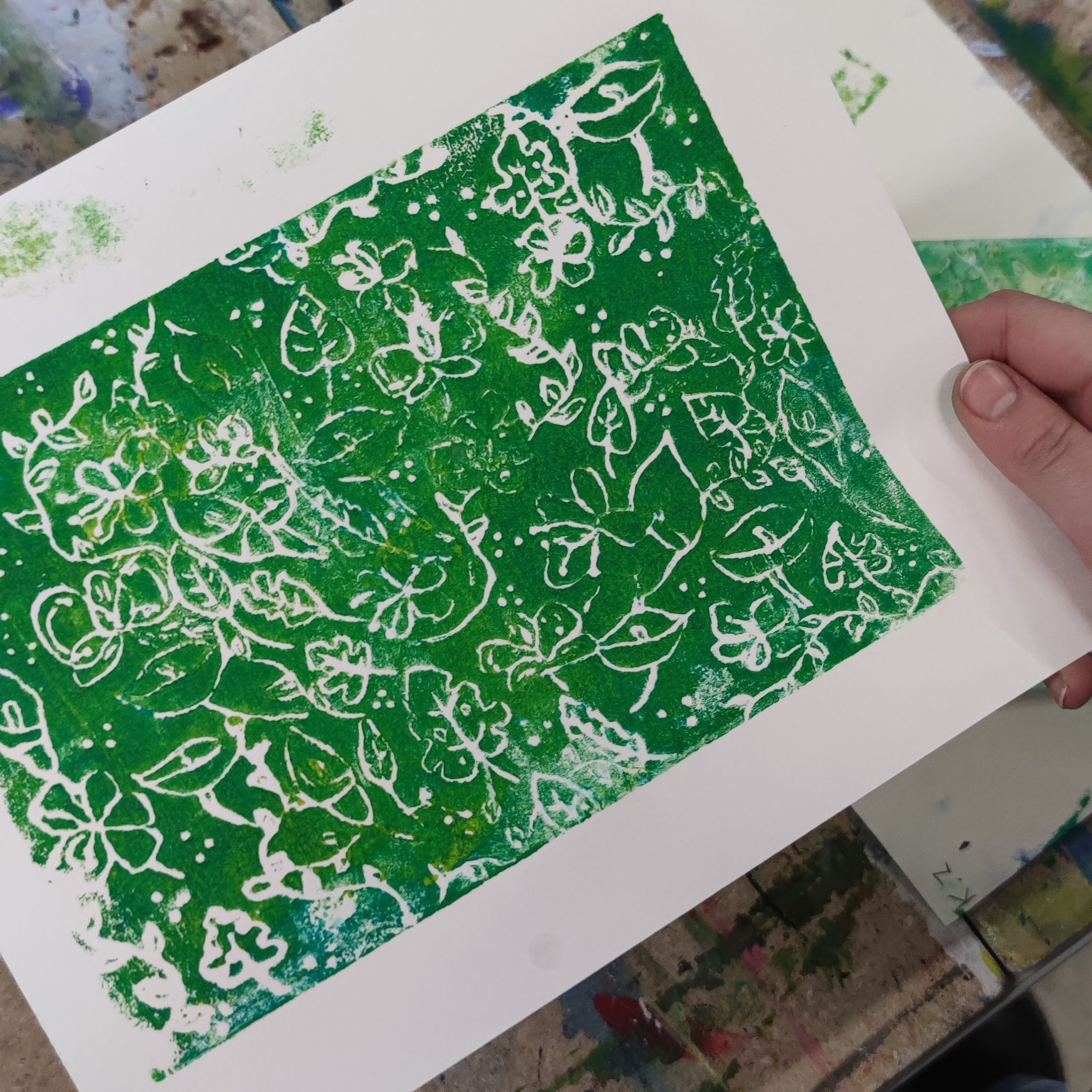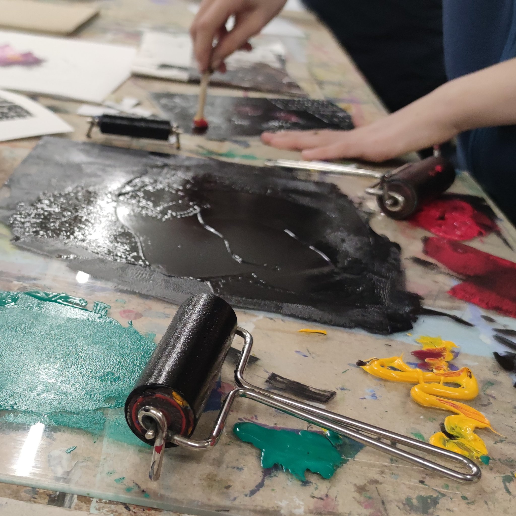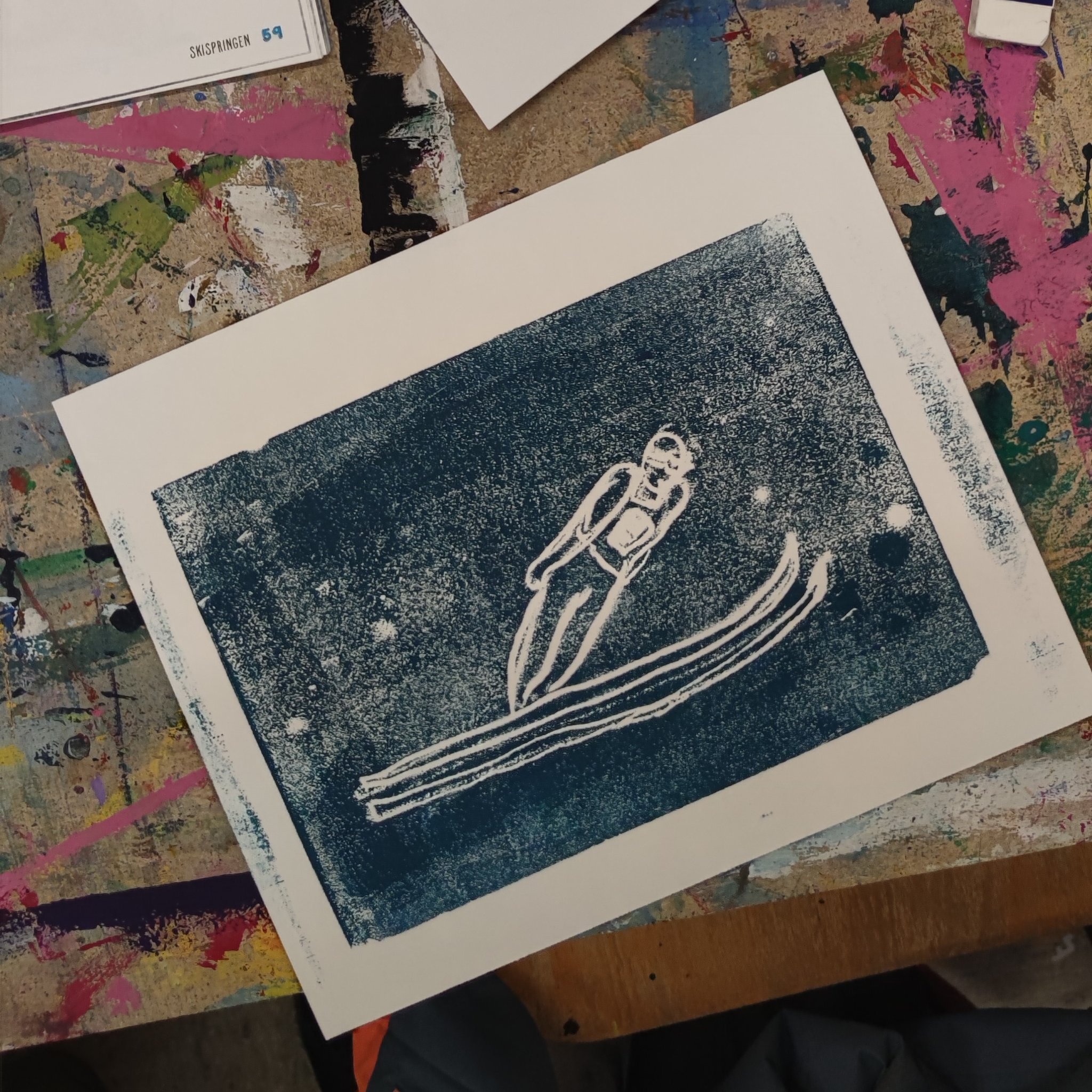 Bei der Druckgrafik wird ein Verfahren gewählt, welches möglichst einfach ist, damit es in der Zeit zu entsprechenden Ergebnissen kommt. Geritzt wird mit Bleistiften in eine Art von Styroporplatte. Diese wird dann wie bei einem Linolschnitt mit einer Farbrolle eingerollt und mit der Hand auf ein entsprechendes Papier gedruckt.
